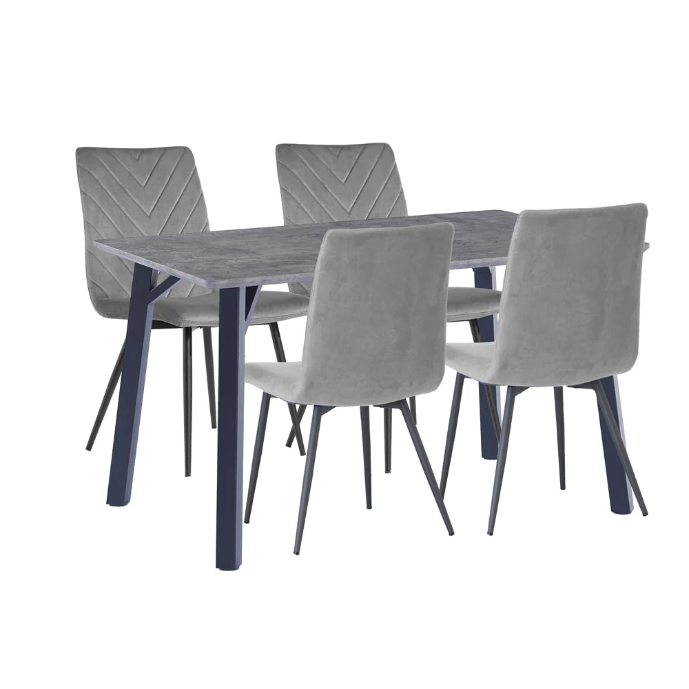 Add a touch of elegance and sophistication to your dining room with this stunning table and chair set. The table features a sleek and smooth concrete effect top that is easy to clean and maintain. The four chairs have a matching black metal frame and a comfortable velvet seat. This set is perfect for any modern or contemporary home, and can accommodate up to four people comfortably. Whether you are hosting a dinner party, enjoying a family meal, or working from home, this table and chair set will provide you with style and functionality.