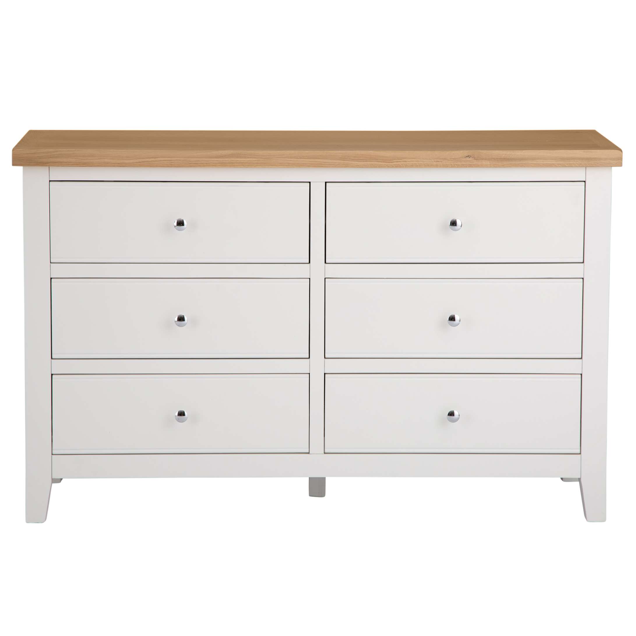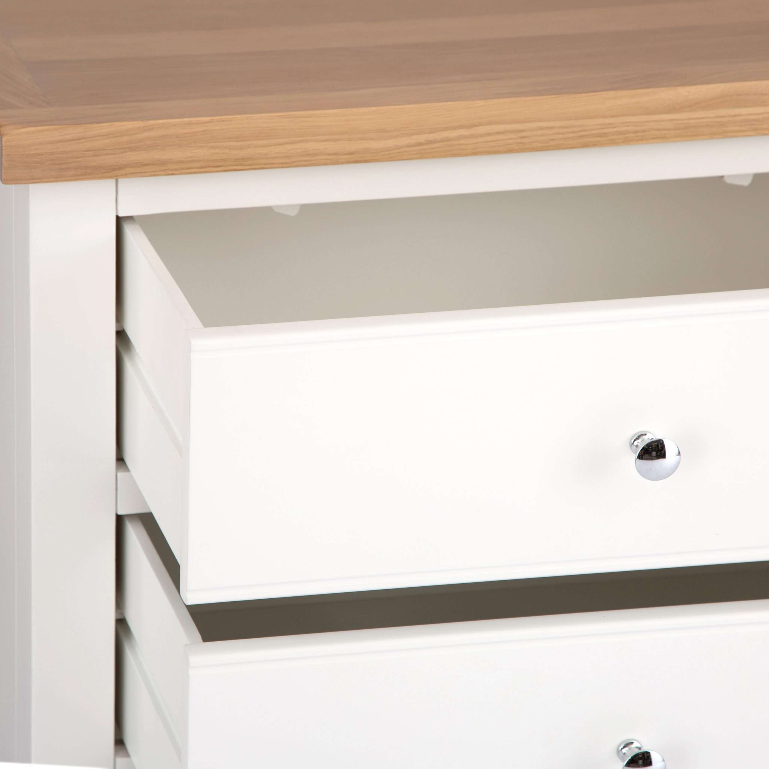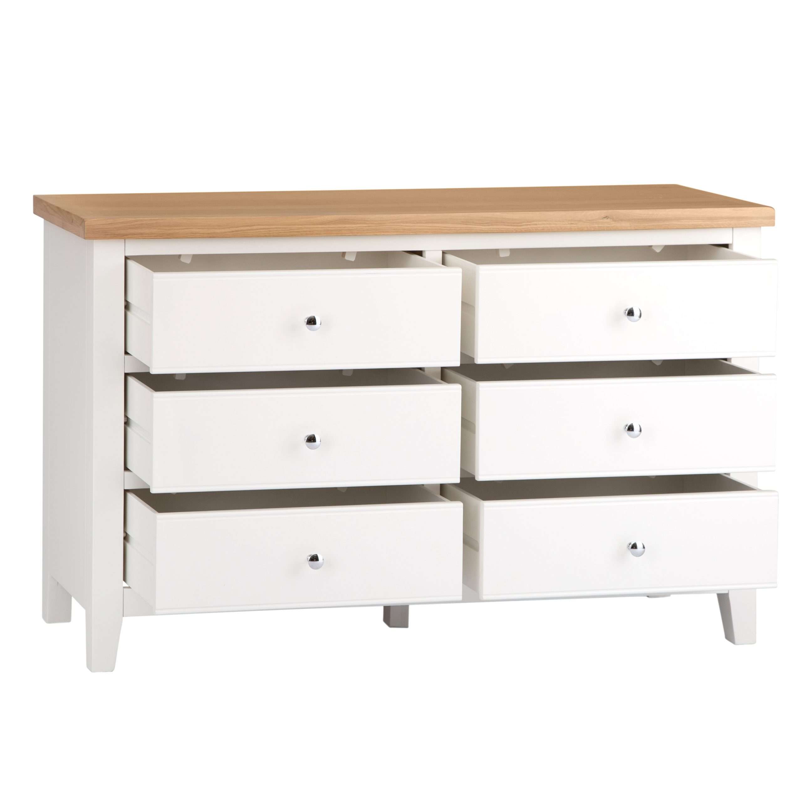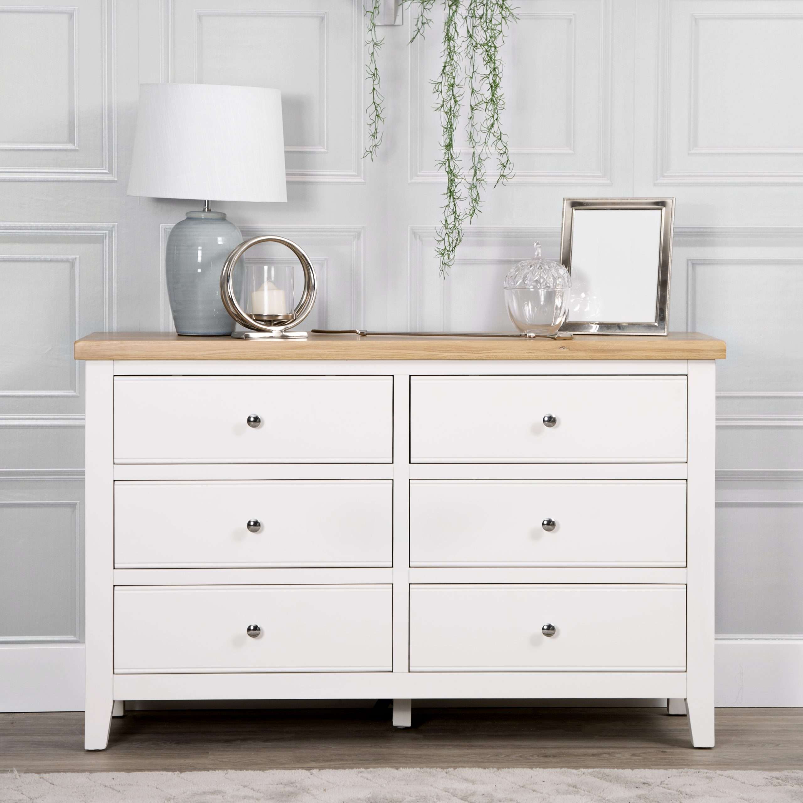 The sleek white finish adds a touch of sophistication to any room, while the oak top brings a natural element for a timeless appeal. Whether used in the bedroom, living room, or hallway, this chest of drawers complements any decor effortlessly. The six spacious drawers glide smoothly on their runners, allowing easy access to your belongings.