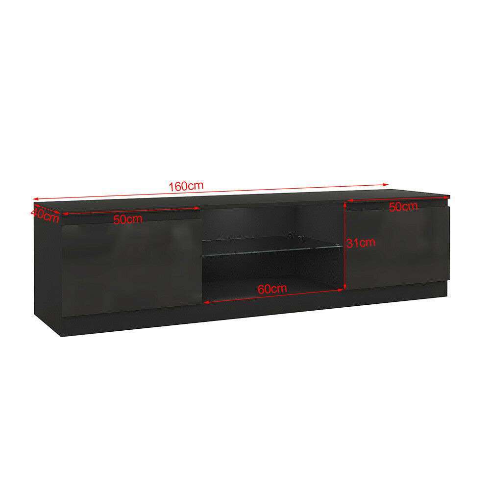 contemporary Black Gloss TV Unit with led Lights that can accommodate TVs up to 75 inches in size. This TV cabinet has glass shelf in the centre and doors made of MDF with high gloss finish. The middle panel is illuminated with RGB LEDs lights (Provided). The framework is made from 16mm board.