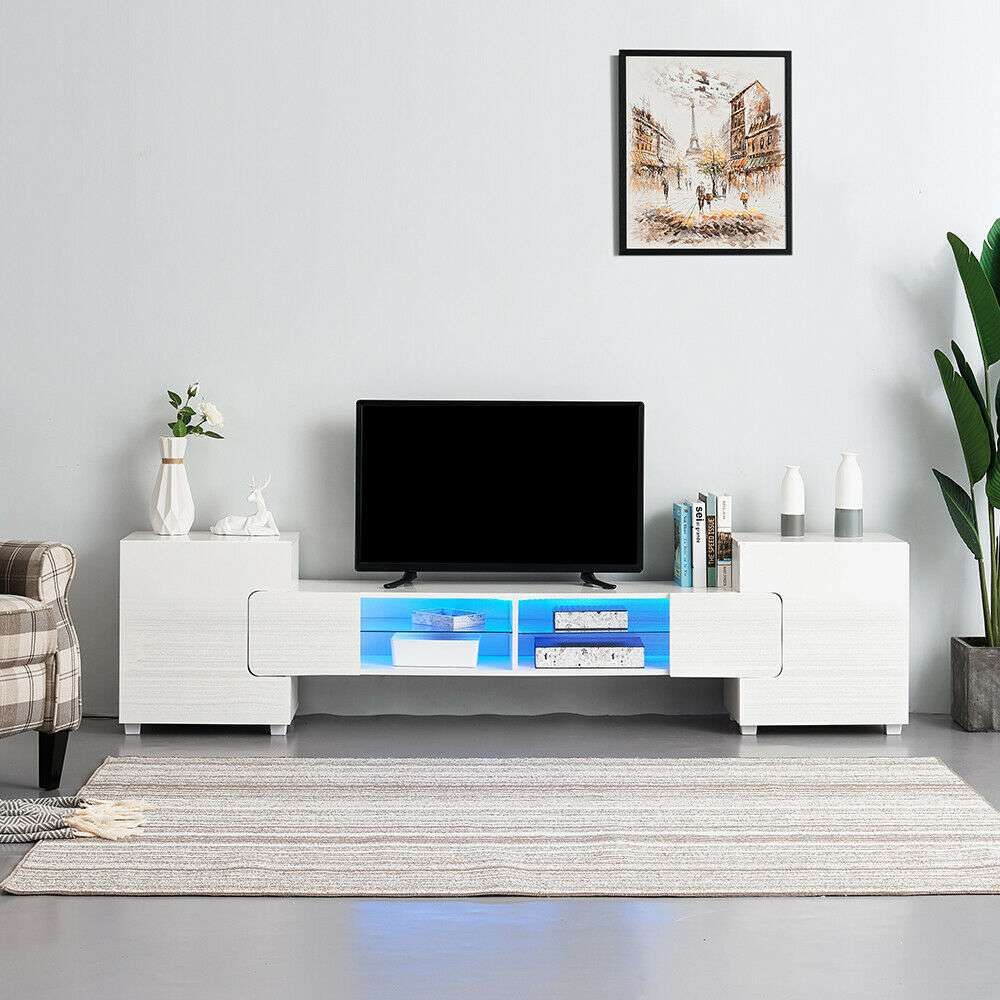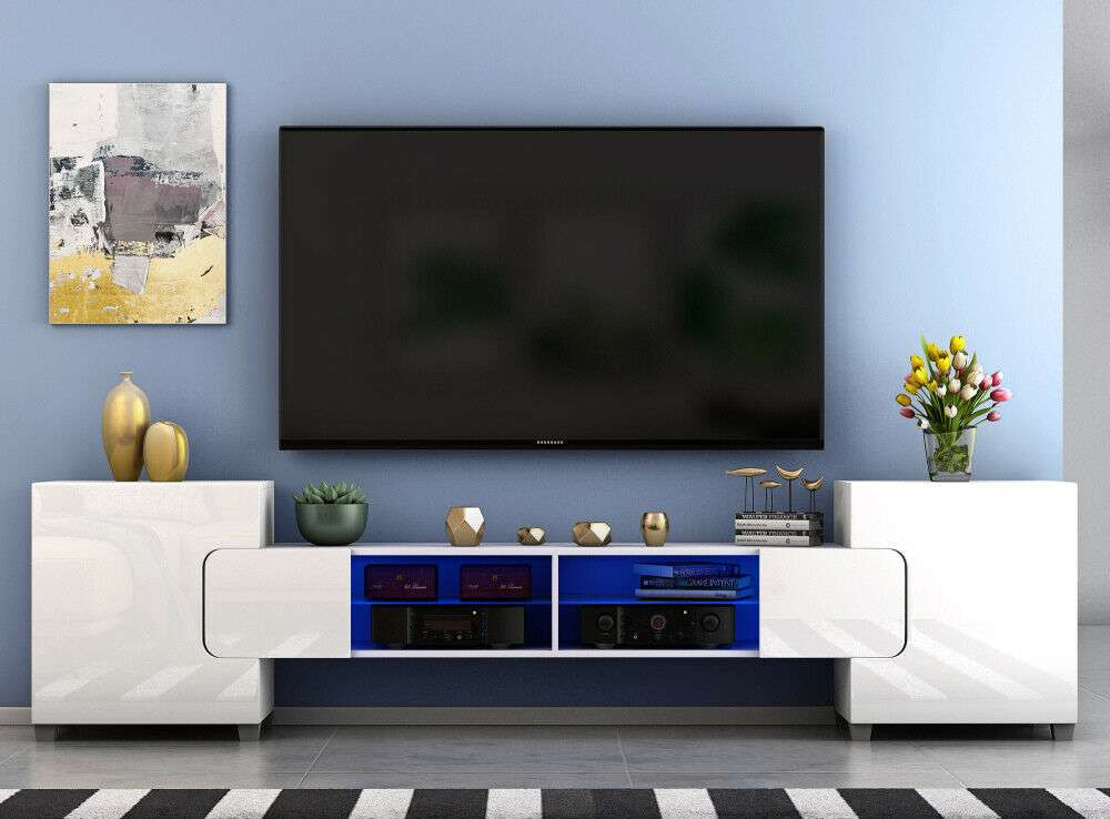 A modern High Gloss TV Unit in White which contain’s a glass shelf in the middle with the doors being made from MDF finished in a high gloss. The middle panel is illuminated with RGB LEDs lights (Provided). The framework is made from 16mm board.