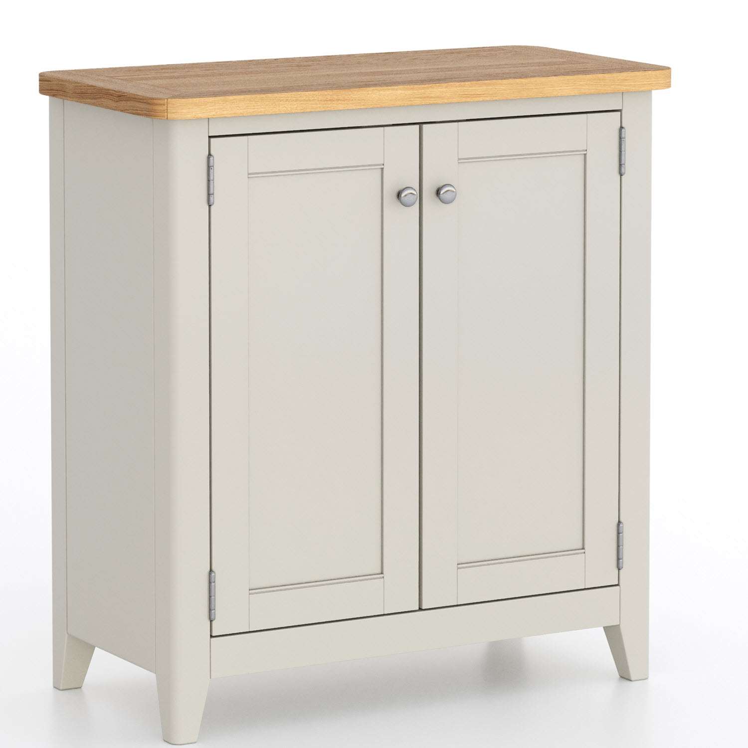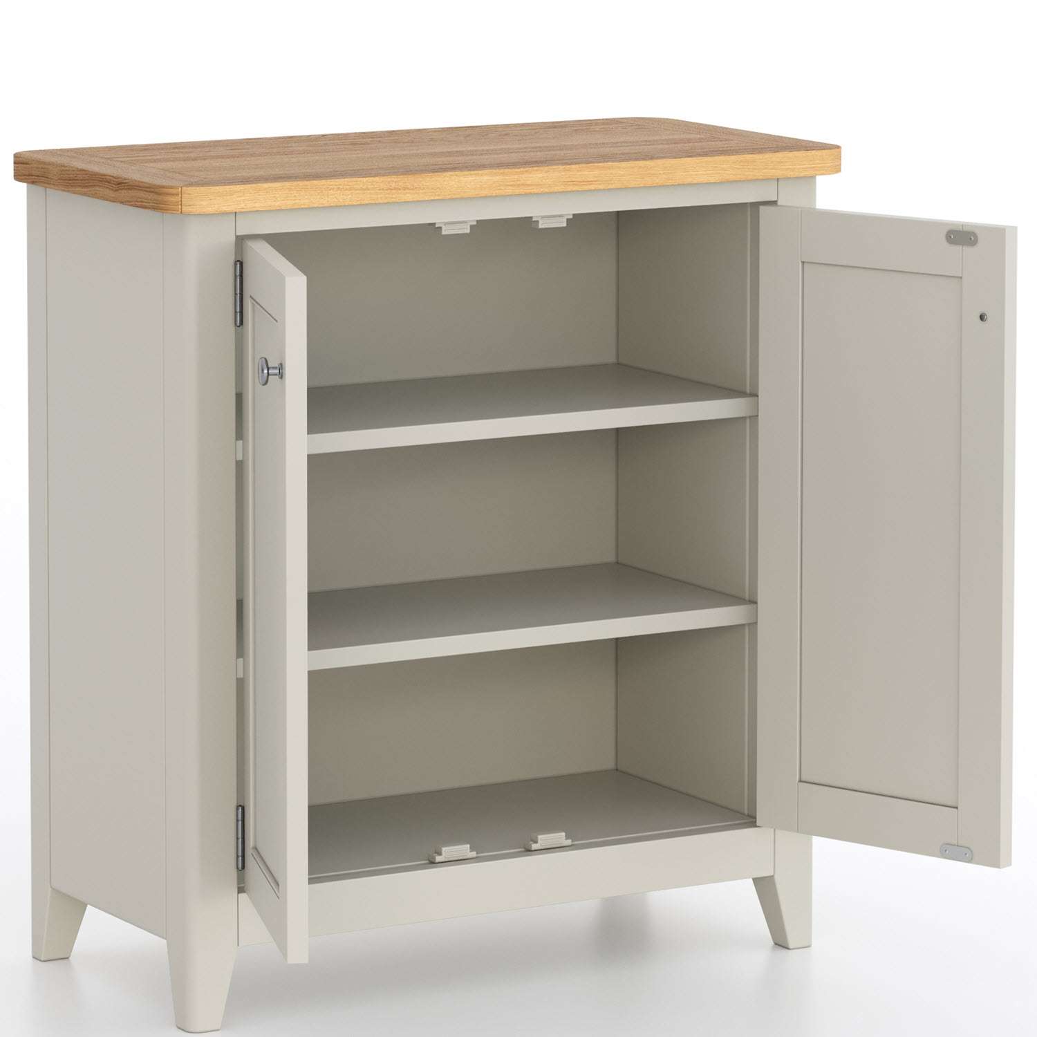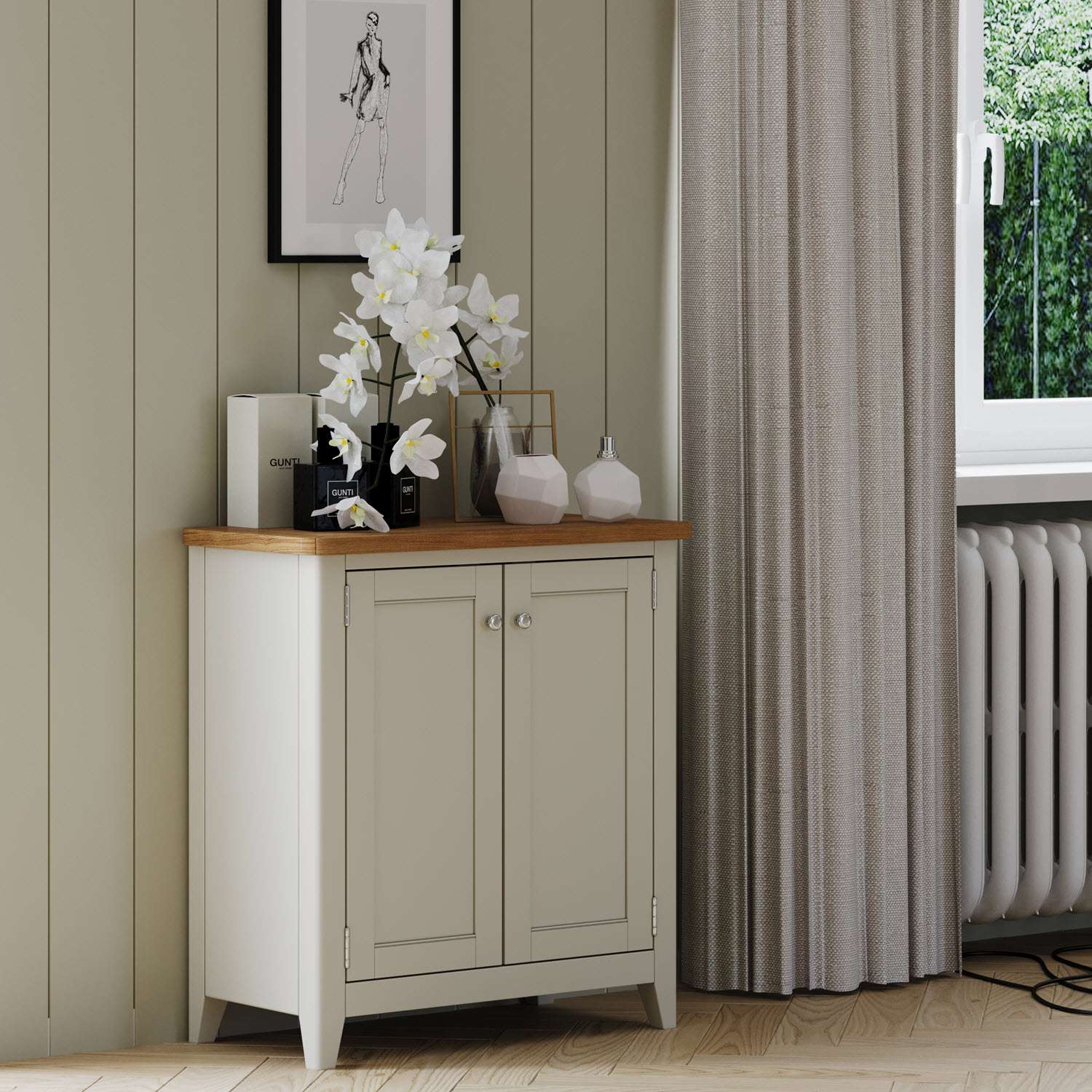In a hallway lacking storage, this cabinet becomes a sanctuary for order. The slim profile prevents it from crowding the entry, while the cupboard offers ample space for shoe baskets, dog walking gear, or bags. Style the oak top with a slender table lamp and a mirror above it to bounce light around the space, making your entrance feel larger and more welcoming.