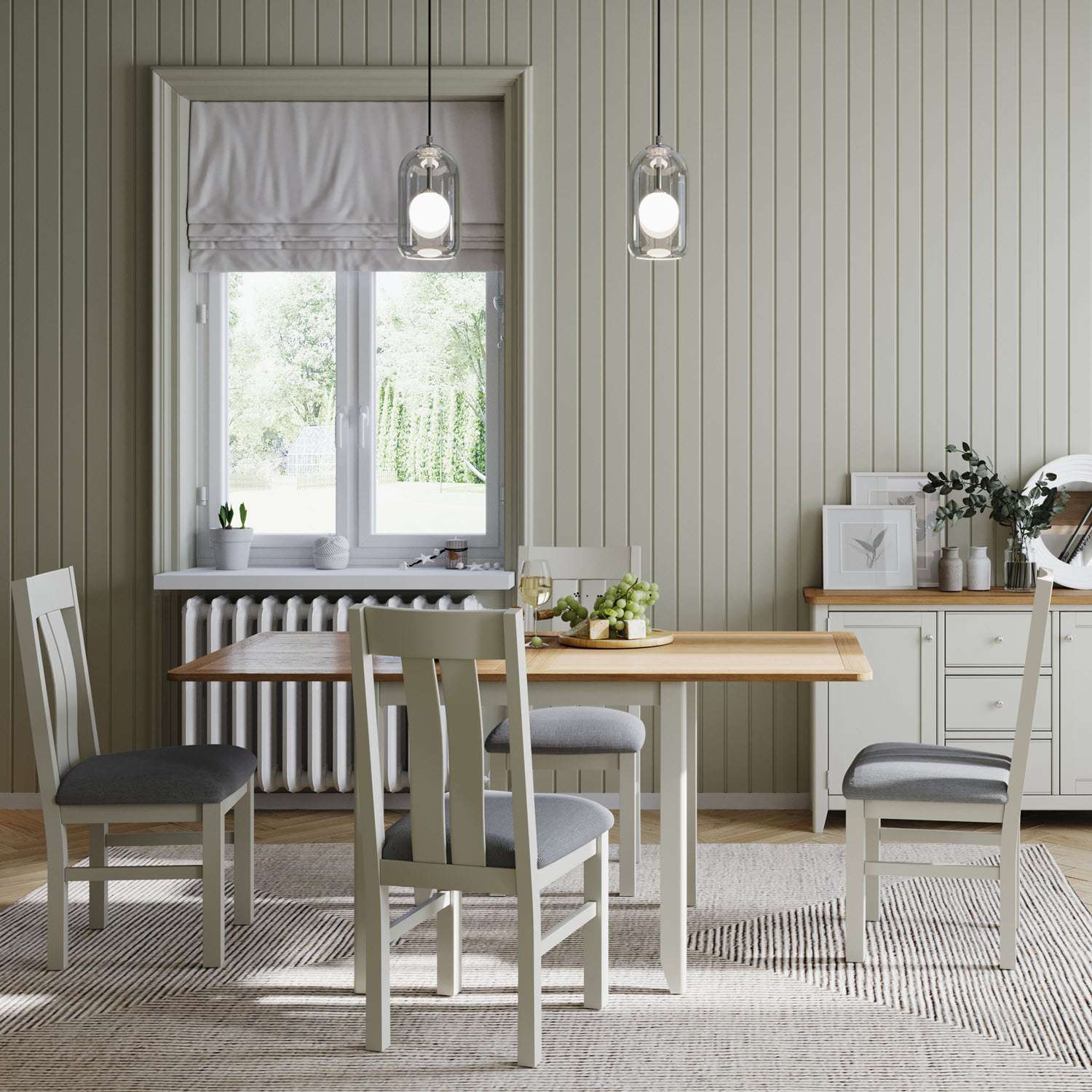 In many homes, the kitchen table is the command centre. It is where homework happens, where laundry is folded, and where quick meals are eaten. Here, we recommend keeping the table in its closed, square format pushed against a wall or in a corner to act as a breakfast bar. Pair it with two of our matching painted dining chairs tucked neatly underneath. When guests arrive, simply pull it into the centre of the room and flip the top. The light grey finish pairs beautifully with sage green or cream kitchen cabinetry, creating a cohesive, farmhouse-chic look.