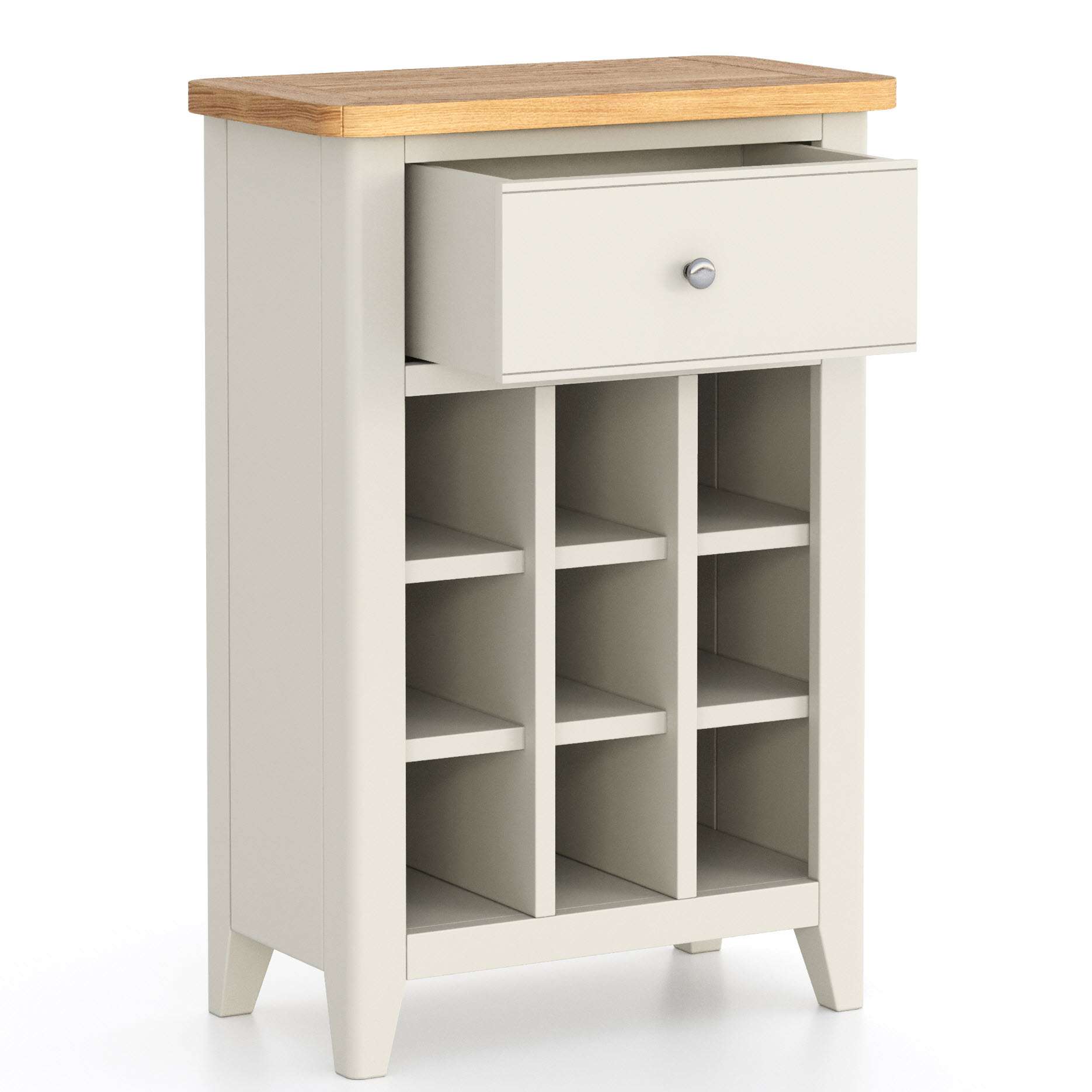 | Features | 1 x Dovetail Drawer, Integrated Wine Rack, Brushed Metal Handle |