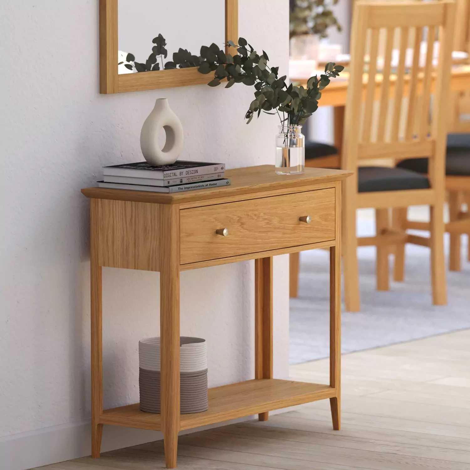 The light oak finish is what makes this console table so versatile. The pale, warm tones work with virtually any colour scheme and make spaces feel larger and brighter rather than closing them in. The visible wood grain adds natural character without being rustic, and the overall aesthetic is one of understated sophistication.