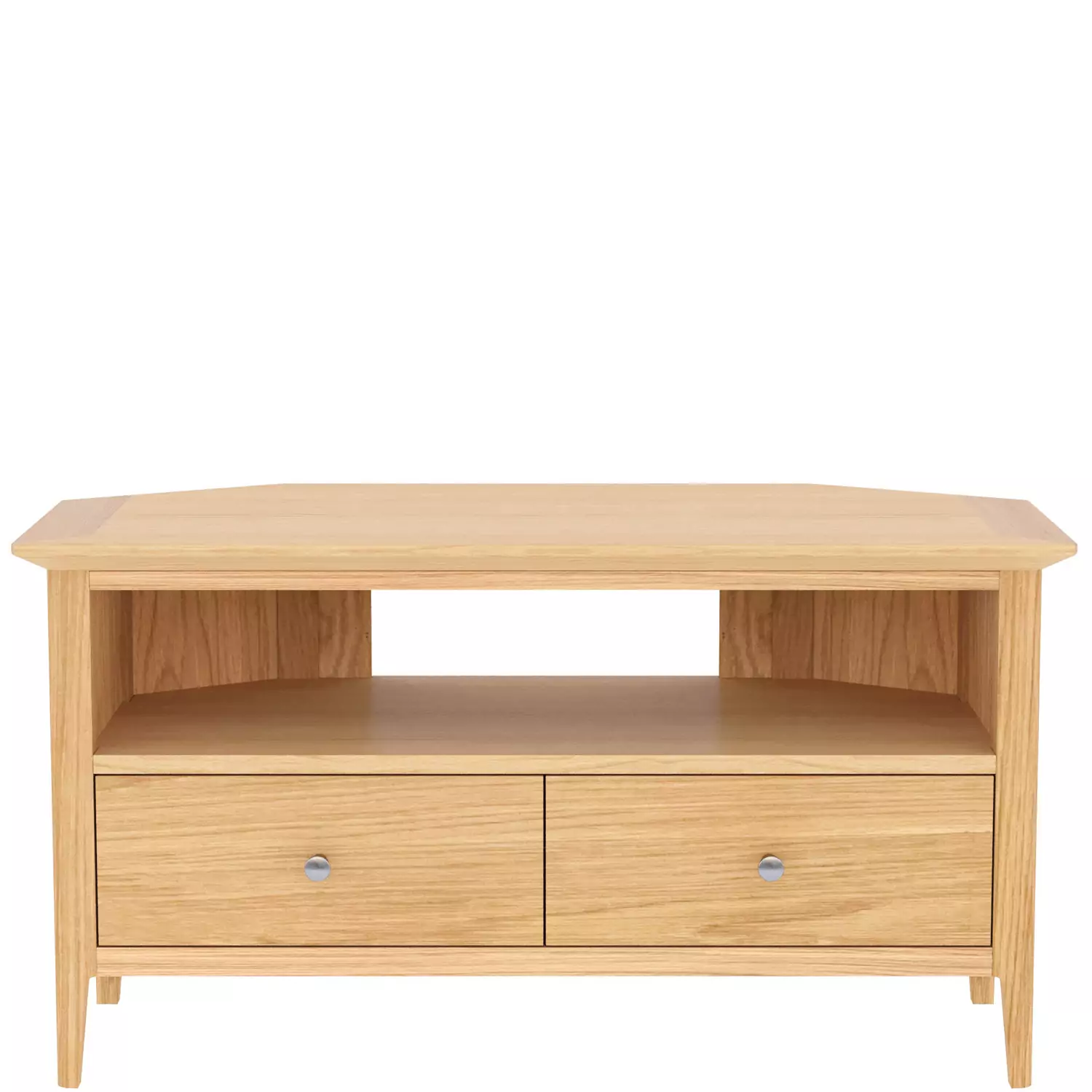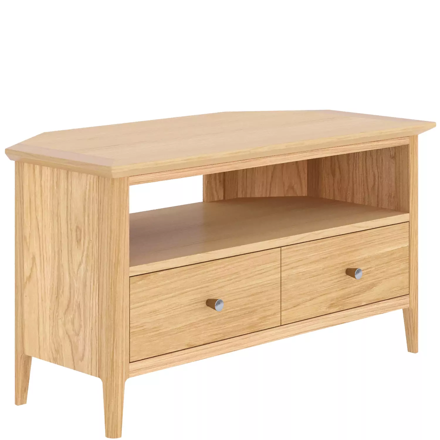 Storage hasn’t been sacrificed to geometry. You’ll find open shelving for media equipment that needs accessibility and ventilation, plus cupboard space concealed behind those attractive -detailed doors. The light oak finish ensures the unit doesn’t darken or close in your corner? A real risk with darker woods in angular placements. Instead, the blonde tones keep things feeling open and airy.