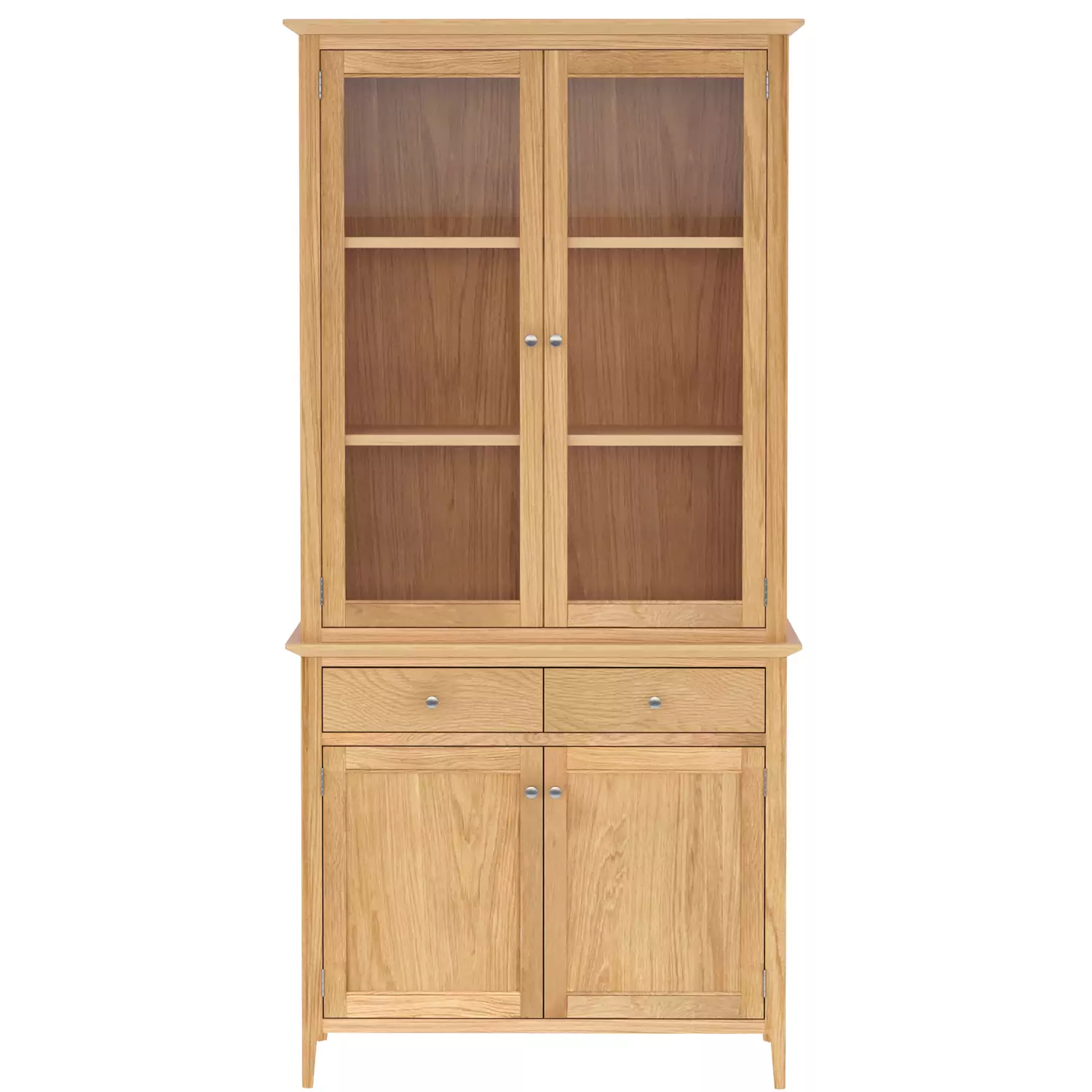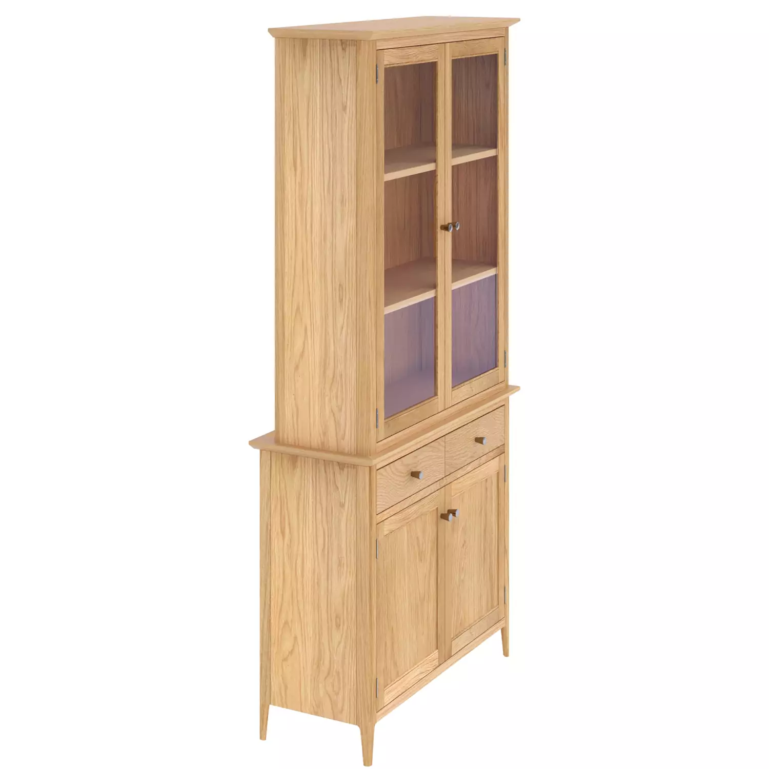 The light oak construction ensures continuity with the sideboard below, creating a cohesive look that feels designed as one piece. The detailing adds that signature London Oak character, while the glass allows light to flow through, preventing the piece from feeling too solid or heavy.