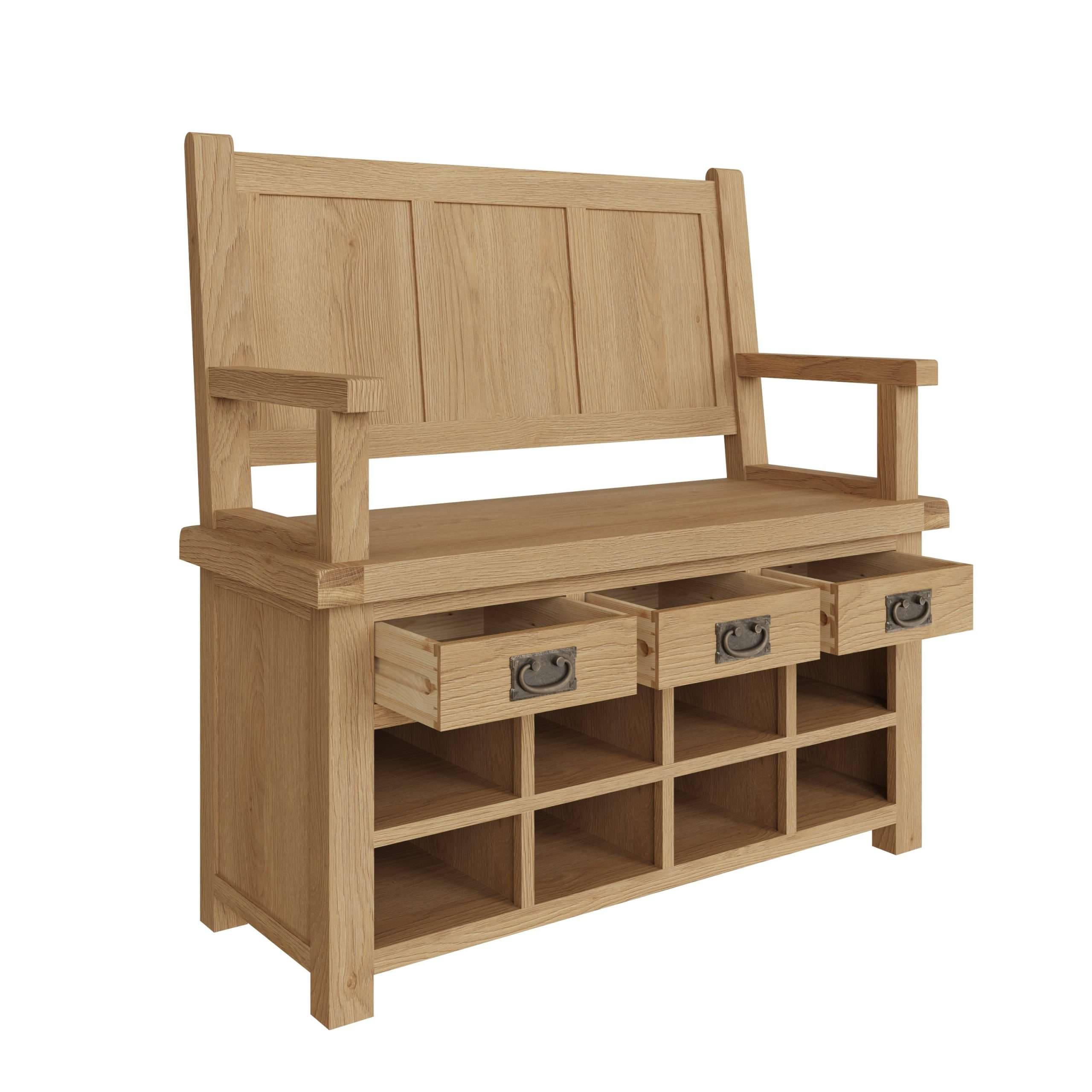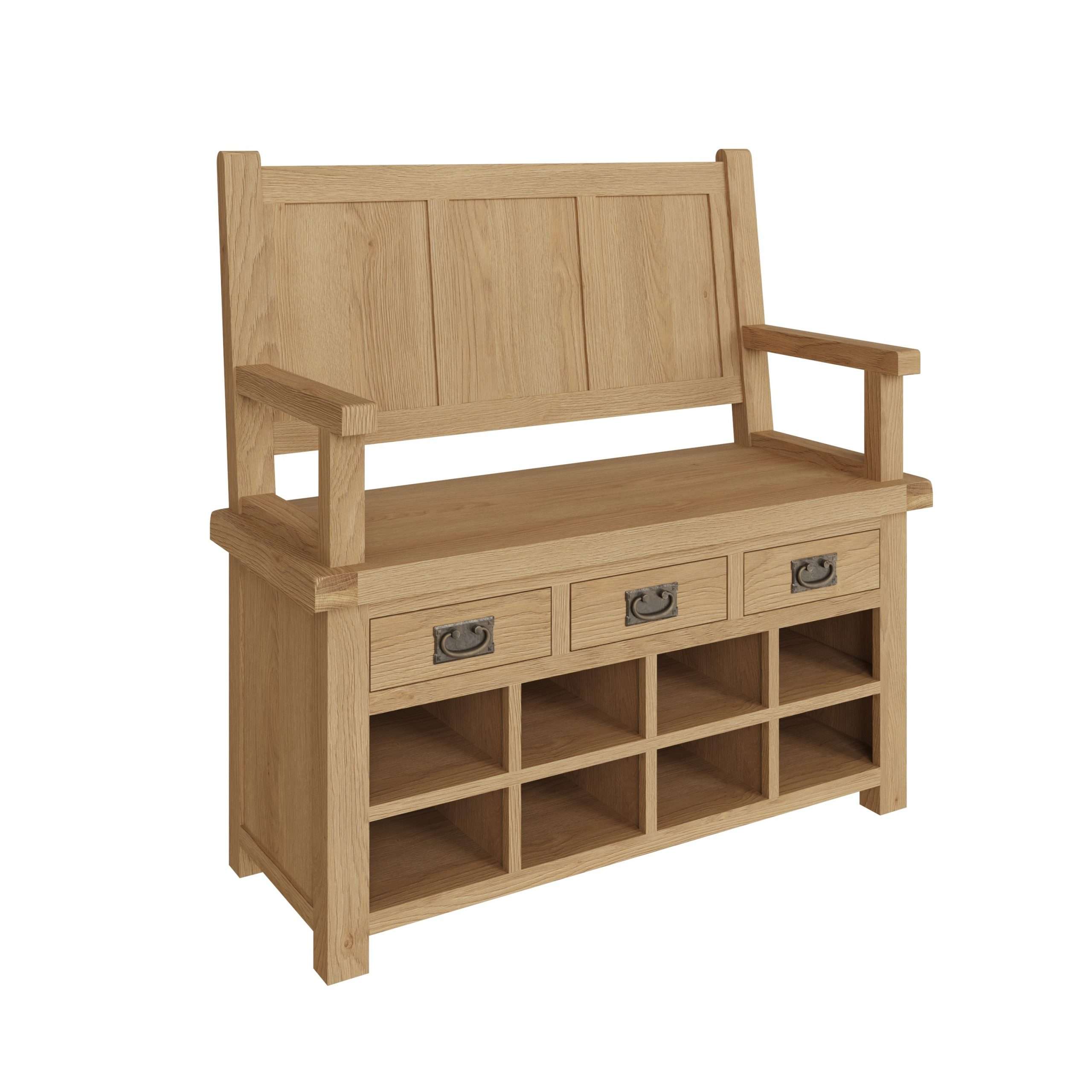 In the bedroom, the Oak Monks Bench can function as a stylish and practical addition to your décor. Place it at the foot of your bed to create a convenient spot for putting on shoes or laying out clothes for the next day. The storage compartment is ideal for keeping extra bedding, pillows, or seasonal clothing items neatly tucked away. Add a soft throw and a few decorative objects to create a visually appealing vignette.