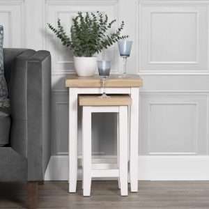 White Painted Oak Nesting Tables Set – 2 Tables with Oak Top